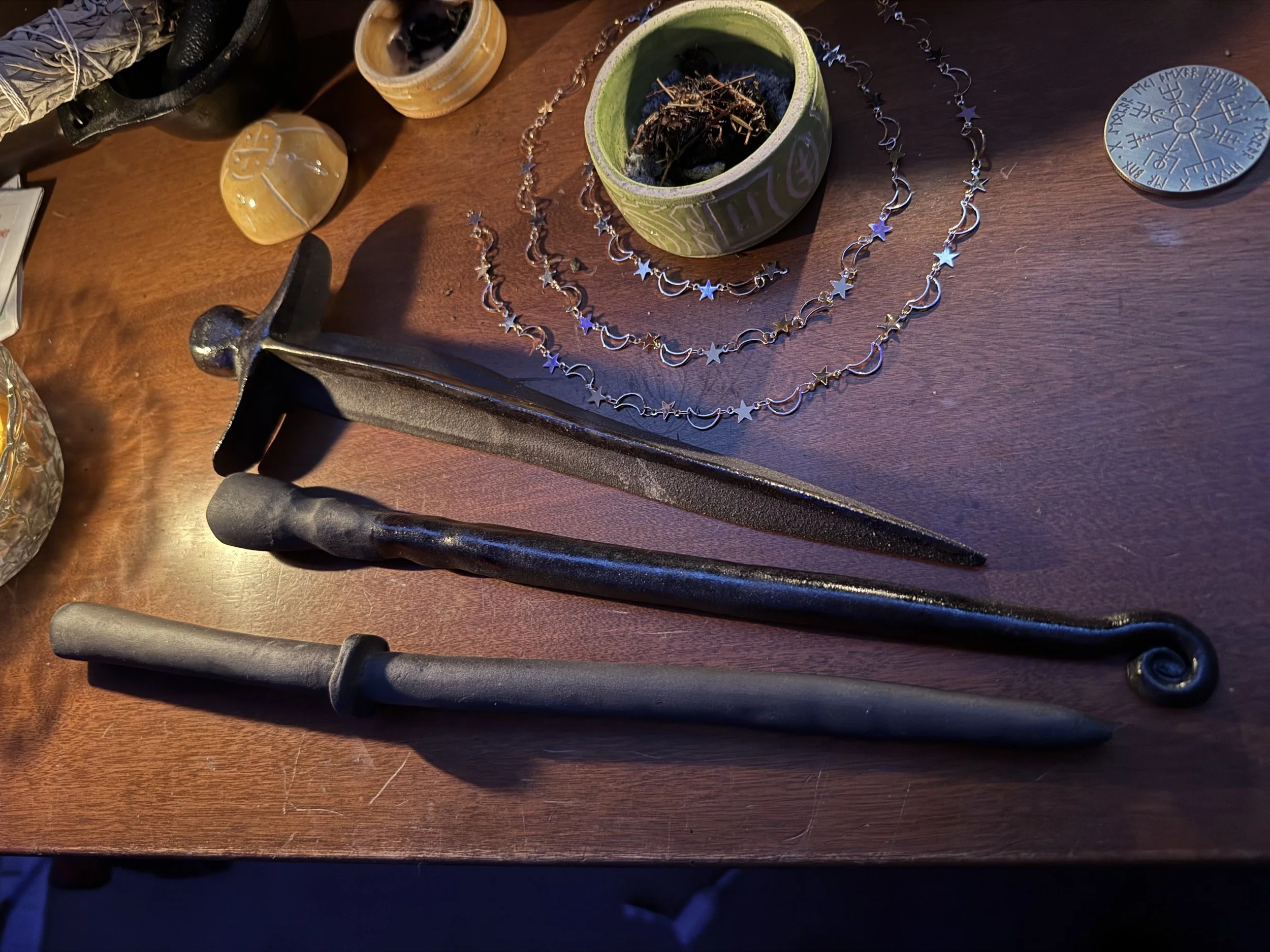 An athame is a ceremonial dagger central to Wiccan and Pagan rituals, symbolizing personal power and the masculine principle, used not for physical cutting but for directing energy, casting circles, and channeling intent. It, as well as the Wand, represents a practitioner's will, acting as an extension of their spirit to interact with the magical world.